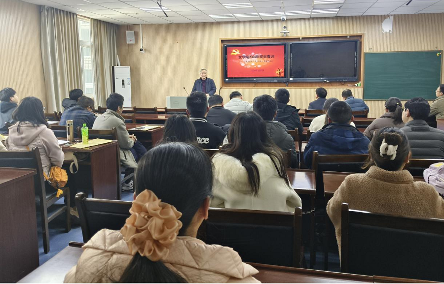 3月7日下午,文学院分党委书记曹弋以“认真学习党章,争做合格党员”为主题在崇文楼B408讲授党员春训第一课,文学院全体党员参与学习。