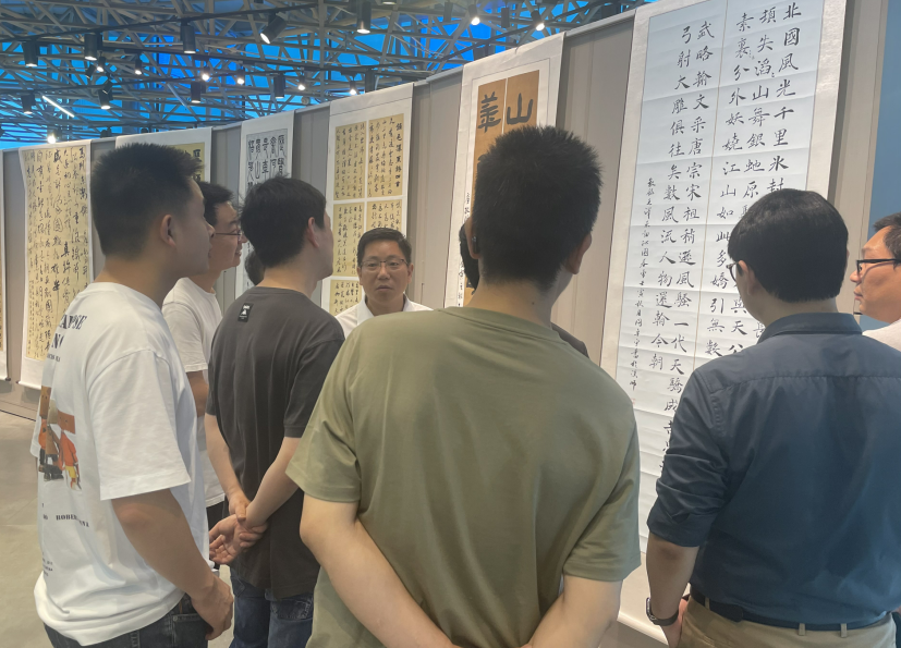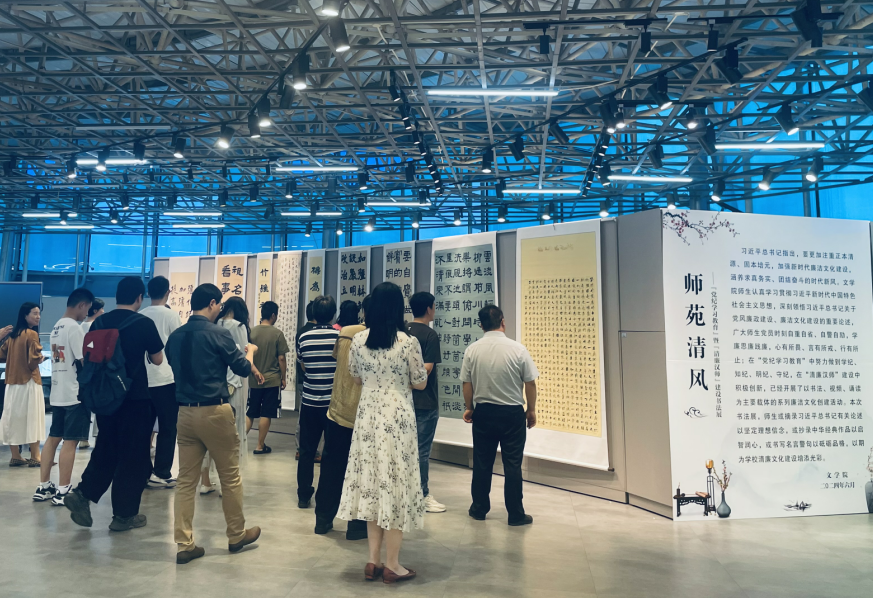 随后,大家共同观摩了文学院精心策划的“党纪学习教育”暨“清廉汉师”建设书法展。此次书法展是在校纪委刘玉松书记和校纪委、监察专员办公室的指导下,文学院组织书法学专业师生围绕党纪学习教育、党风廉政建设和清廉文化建设,创作的60余幅书法作品。这些作品不仅展示了文学院师生的艺术才华,更传递了清廉自律、遵纪守法的重要理念。
