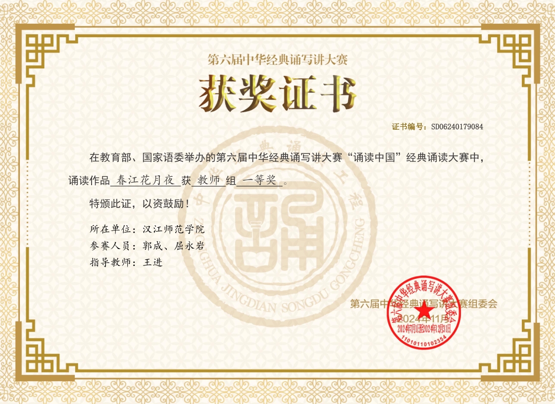近日,由教育部、国家语委共同主办的第六届中华经典诵写讲大赛全国总决赛获奖名单公布,我校文学院教师郭成、屈永岩在大赛中表现突出,朗诵作品《春江花月夜》在“诵读中国”经典诵读大赛全国总决赛中荣获(大学教师组)一等奖。本次经典诵读大赛总决赛在浙江传媒学院举行,参赛选手采用现场朗诵形式,展示教师对中华经典作品的理解能力与诵读水平。