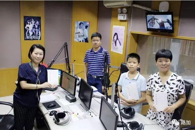 尹继雄及家人(爱人王丽,儿子尹品俊)携新书《我把大海折叠》做客晋江市广播电视台的情景。