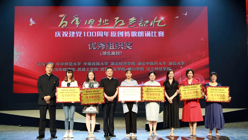 据悉,此次活动由湖北省文联指导,湖北省朗诵艺术家协会和湖北电视艺术家协会主办,旨在以原创诗歌及朗诵的形式向建党百年献礼,警示后人不忘历史,砥砺前行。此次活动前期征文六十多篇,分别为全省中小学生、大学生、全体朗协会员共八千多人广泛传诵,有123位个人和22个单位获奖,其中12所高校获奖。