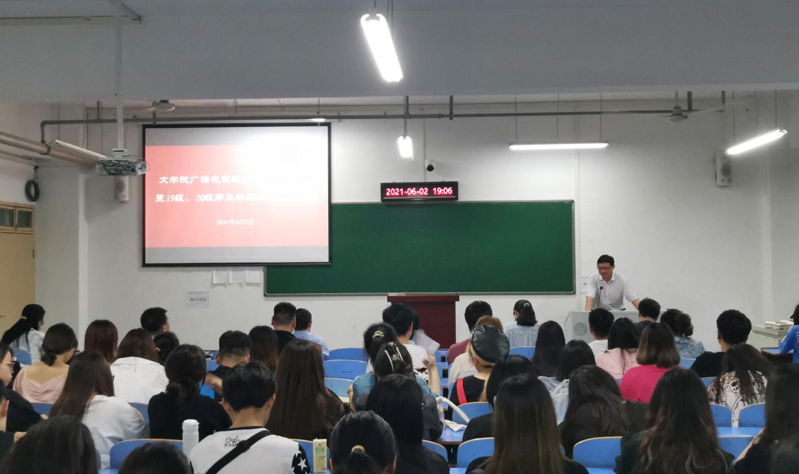 6月2日,文学院在崇文楼A512召开广播电视编导专业学生大会暨19级、20级第三学期实习动员大会,院长郝文华、专业教师饶军教授、副院长赵崇璧、副院长曹国军、副书记任自玲、学工办主任彭涛、辅导员曾晓东、柳宇老师参加本次会议。广播电视编导专业137名学生全员出席本次会议。会议由新闻传播教研室主任戴文雄主持。