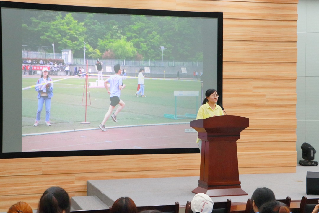 党总支副书记任自玲通报了近期文学院所有体育赛事的成绩。她讲道,优异成绩的取得是文学院健儿们不畏风雨、奋勇拼搏的结果;是文学院学生会、分团委、自律委员会和资助委员会各组织相互协作,全心全意为运动员服务的结果;从中可以体现出我们文学院师生的体育精神,那就是奋勇拼搏、团结协作。