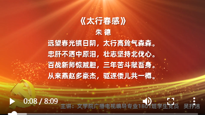 日前,经过多日筹划的第一期微党课上线。为深入开展党史学习教育,把学习教育与专业相结合,文学院党总支策划了系列讲党史故事、赏红色诗词活动。学生一、二党支部首批组织了5名优秀学生党员,来赏析5篇革命诗词。这里发布的是吴抒洁同学赏析《太行春感》(朱德)()。