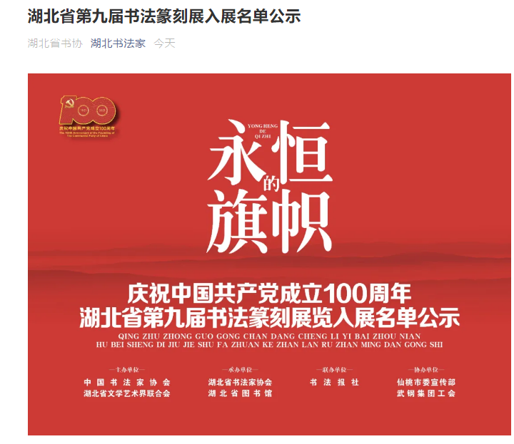 4月21日,湖北省第九届书法篆刻展评审入展名单公示,文学院语教(书法)18级学生龚卫仁(楷书)、语教(书法)15级校友王羽(隶书)入展。