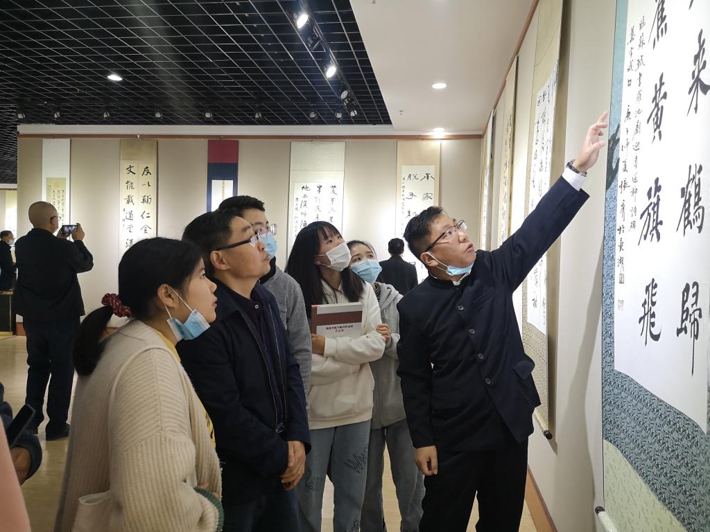 黄振东老师在展厅中就入展作品的用笔用墨、结构处理、章法布局,以及落款、钤印等问题给学生讲解。同学们表示,通过本次集体看展,提高了书法鉴赏能力,开阔了眼界,尤其更加明晰了作品的章法布局与作品形式问题,为以后的临写与创作提供很多借鉴。