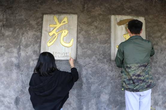 下午2点40,同学们再次来到墨苑为碑石进行描金。分发专业用具、清洁碑石、揣摩原碑笔法笔意、上金墨……学生们互相协作,有条不紊。