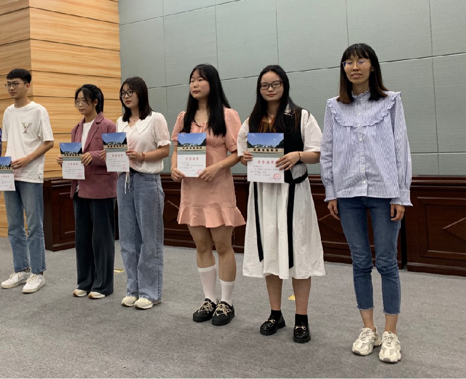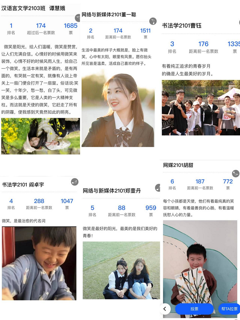 展演第一个环节:最美微笑摄影展获奖作品展示。本次摄影展获奖作品根据文学院学生会组织网络投票排名,获得一等奖的是汉语言2103班谭慧蛾;获得二等奖的是网媒2101班董一聪和书法2101的曹玉;获得三等奖的同学是书法2101闫卓宇、网媒2101郑壹丹、网媒2101胡甜。