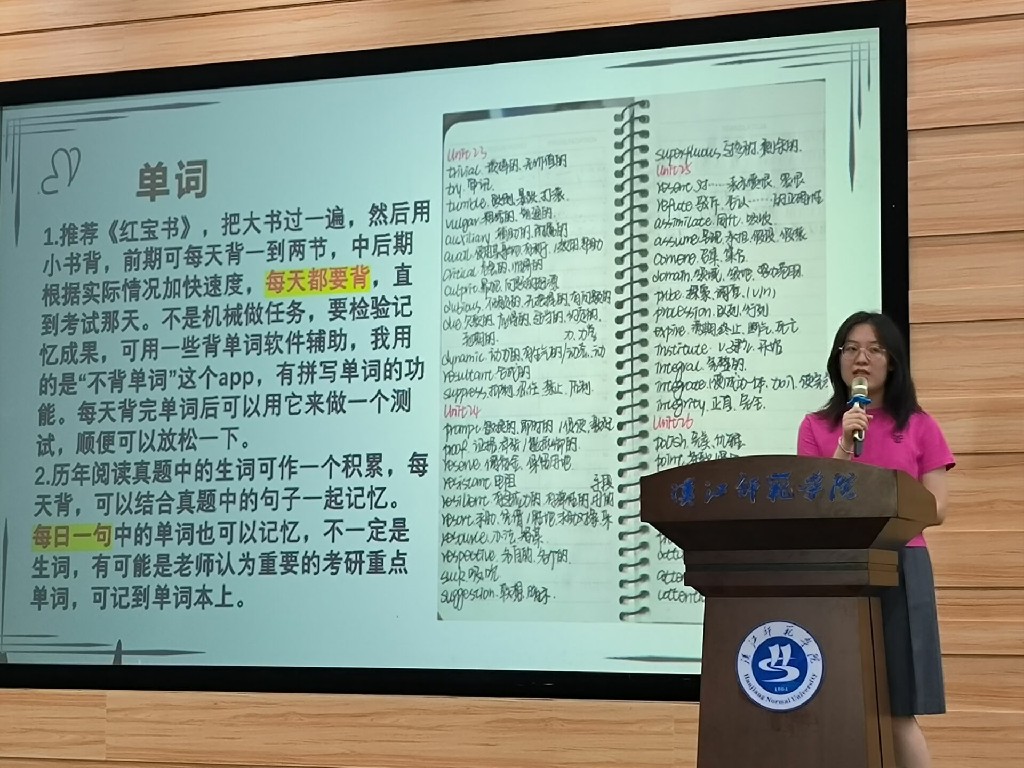 三位同学从考研计划安排、资料准备、各科学习方法等方面展开了细致、具体的总结分享,展示了各自的考研笔记,向学弟学妹们传授了考研备考方法,以及如何合理选择报考学校;强调劳逸结合和保持良好心态的重要性,提醒同学们在努力备考的同时,也要学会自我调整和自我鼓励。