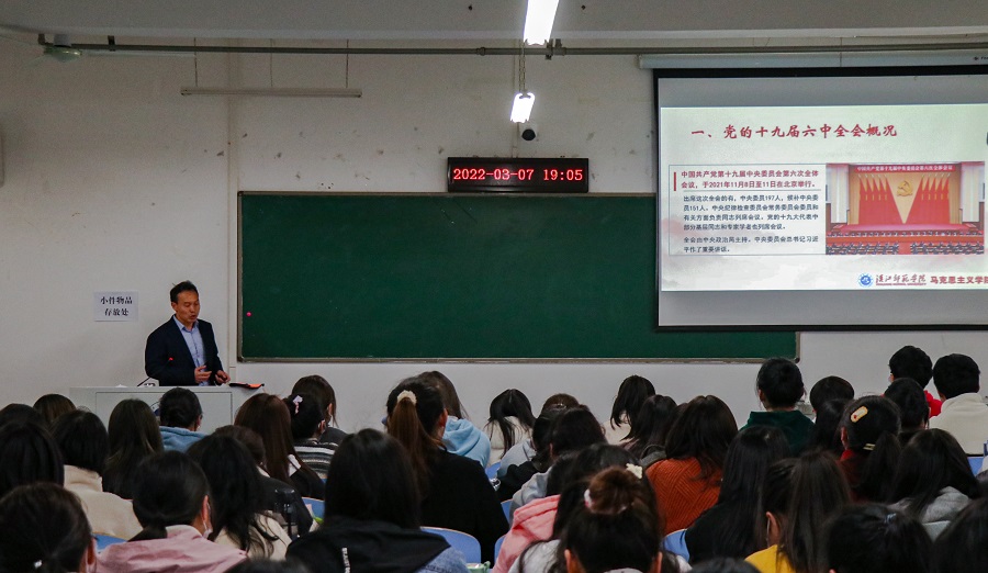“我们不是生活在一个和平的年代,而是生活在一个和平的国家……我们应该好好学习,努力回报,为祖国建设贡献力量。”3月7日晚,校党委副书记周明华教授走进崇文楼A416教室,为文学院2021级汉语言文学专业、广播电视编导专业同学带来了一堂生动的主题党课,指导大家学习领会十九届六中全会精神。