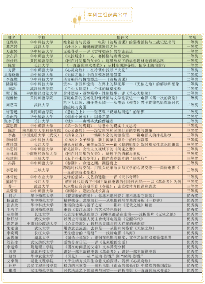 为响应教育部“五育并举”的号召,体现湖北高校影视美育教育成果,展示当代大学生良好的精神面貌与人文修养,湖北省电影家协会举办第二届湖北省大学生影评大赛,特面向全省各高校大学生征稿。本届大赛由湖北省电影家协会主办,华中师范大学新闻传播学院承办、华中师范大学影视传播研究中心官方微信公众号“第七次浪潮”工作室协办。本次大赛面向湖北省各高校全体学生征稿,包括专科生、本科生和研究生等,鼓励各高校老师推荐学生参赛。