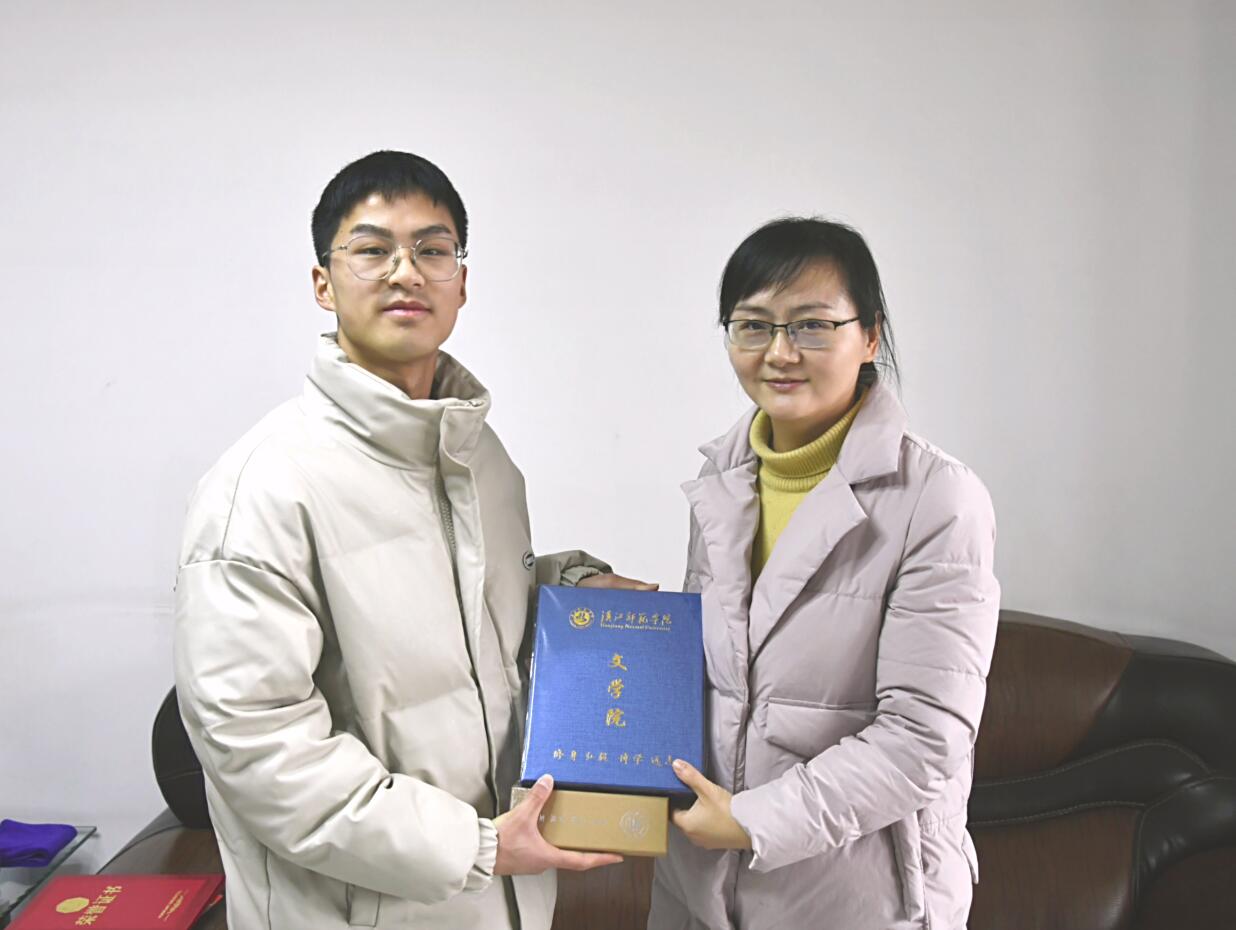 文学院党总支副书记任自玲代表学院向陈星天赠送了学院的文创纪念品,感谢他为文学院学子树立了榜样,鼓励他坚持学习、进一步提升个人思想觉悟,更好地展现大学生积极向上的精神风貌。