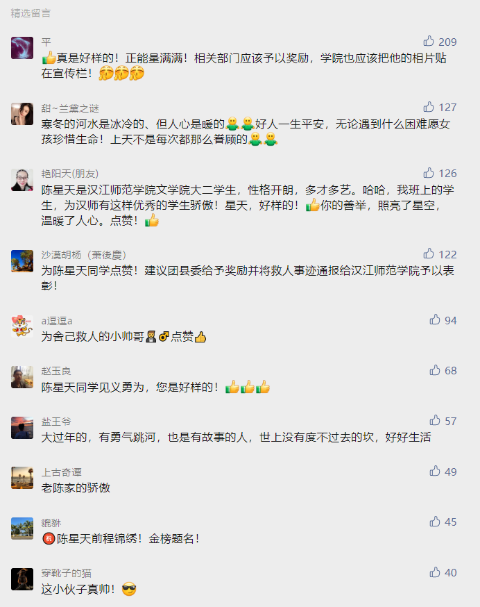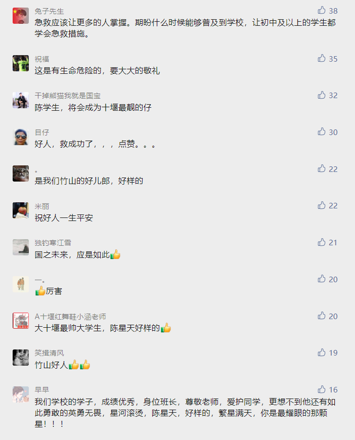 据了解,陈星天是汉江师范学院,文学院语文教育专业大二学生,此前曾学习过急救技能,没想到这次派上了用场。陈星天的事件一经十堰晚报公众号报道,在网上迅速引起热议,短短4个小时阅读量就接近4万,大家都为陈同学见义勇为的行为点赞。