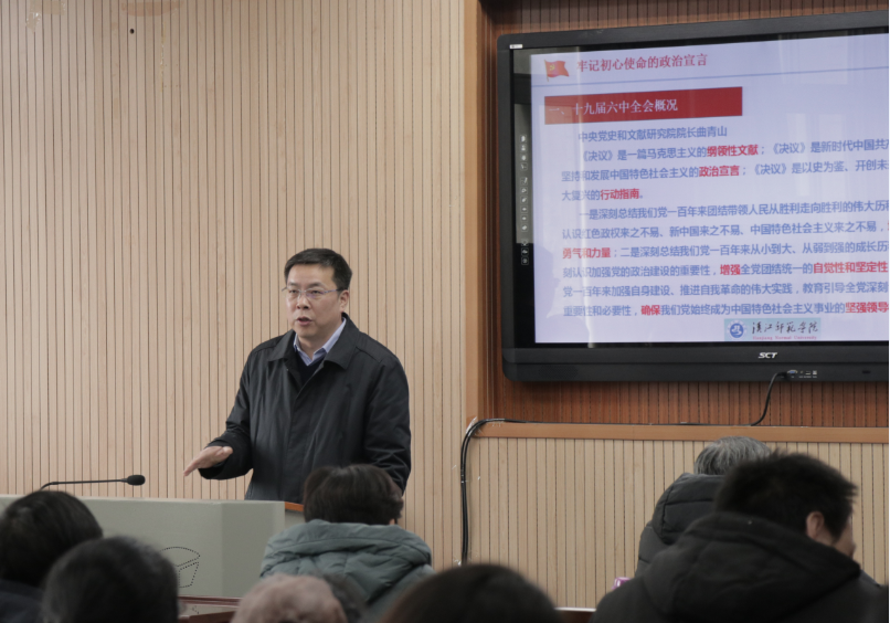 1月10日,校长付永昌以《牢记初心使命的政治宣言——十九届六中全会精神学习体会》为题,在B408教室向文学院教师宣讲党的十九届六中全会精神。