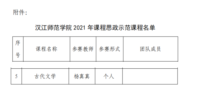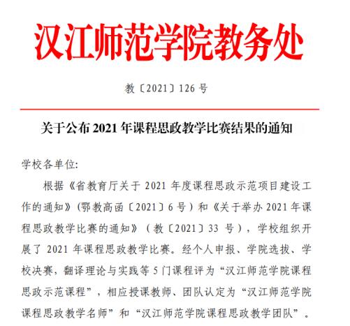 根据《省教育厅关于 2021 年度课程思政示范项目建设工作的通知》(鄂教高函[2021]6号)和《关于举办 2021年课程思政教学比赛的通知》(教[2021]33 号),学校组织开展了 2021 年课程思政教学比赛。经个人申报、学院选拔、学校决赛,我院《古代文学》课程获汉江师范学院 2021 年课程思政示范课程,参赛教师杨真真个人获课程思政教学名师称号。