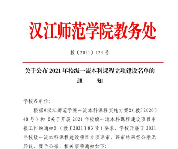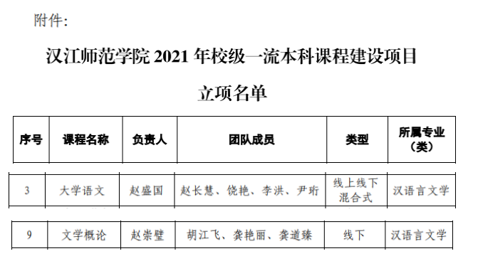 根据《汉江师范学院一流本科课程实施方案》(教〔2020〕40号)和《关于开展2021年校级一流本科课程建设项目申报工作的通知》(教〔2021〕83号)要求,学校开展了2021年校级一流本科课程建设项目立项评审,经个人申报、二级学院推荐、专家评审。我院赵盛国、赵长慧、饶艳、李洪、尹珩申报的《大学语文》课程获批学校线上线下混合式一流本科课程建设项目。赵崇璧、胡江飞、龚艳丽、龚道臻申报的《文学概论》课程获批学校线下一流本科课程建设项目。