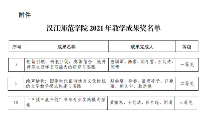 根据《汉江师范学院教学成果奖励实施办法(试行)》(汉师校办[2019]10号)等文件要求,经团队申报、二级学院推荐、专家评审、教学指导委员会审定,我院“创新引领,研教互促,赛练结合:提升师范生汉字书写能力的研究与实践”获一等奖,“绘声绘色:图像时代面向地方文化传统的文学教学模式构建与实践”获二等奖,“三技三展三创”书法专业实践模式探索获三等奖。