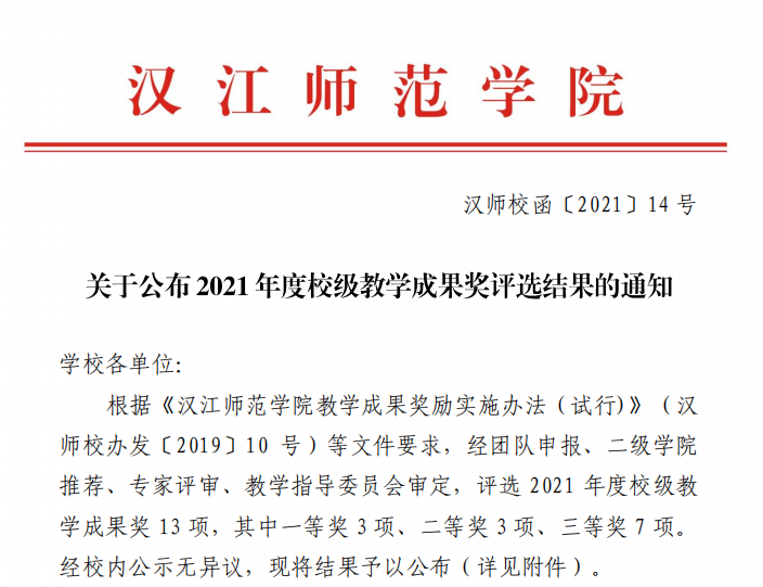 近日,学校下发《关于公布2021年度校级教学成果奖评选结果的通知》,我院三项教学成果分别获得一、二、三等奖。