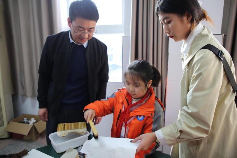 11月29日,书法文化研究中心黄振东、王刘涛两位老师带领文学院书法学部分学生,来到东风52小学。在该校报告厅,黄振东老师首先向同学们介绍了“拓片”的历史渊源和使用工具,然后演示了清洗拓面、上纸、上墨、取拓片的拓片制作的完整过程。接下来,黄振东老师与王刘涛老师一行对学生进行分组指导,在学生精心制作下,一幅幅 “拓片”诞生了,在制作完一幅“寿”拓片后,字52小学四年六班黄钰涵笑着说:“拓片,真是太有意思了,不过,没有想像中的那么容易,是需要耐心、细心和技巧的,下一次,我会拓得更好!”