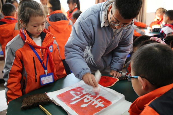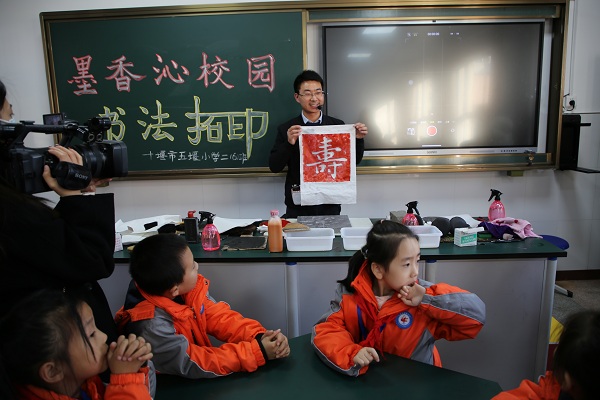 12月6日下午,十堰市五堰小学联合汉江师范学院开展“书法传承与实践”活动,汉江师范学院文学院副院长曹国军、书法教研室黄振东、书法教师王刘涛等一行来到五堰小学,为学校二年级师生带来一堂主题为“墨印流芳巧拓印”的主题实践课,学生们在专家老师的讲解和指导下,学习拓印知识,完成了一幅幅精致的拓片作品,体验到中国历史和传统文化。