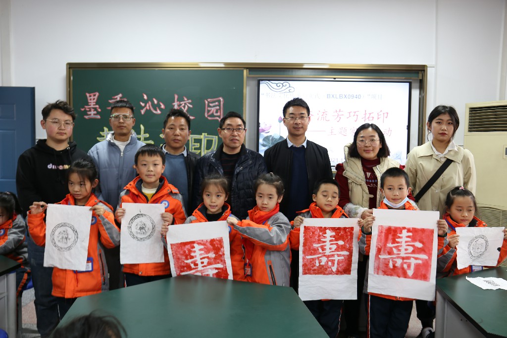 活动在该校二(6)班开展,由班主任董洵老师主持,校长袁炳陆、副校长王启梅莅临现场指导。首先,王刘涛老师讲解了传统书法碑刻传拓的基本知识,展示了传拓使用的工具,然后精心操作,在小学生们一双双惊奇的眼神中从碑版上拓下一个鲜红的“寿”字,完成了一件作品。