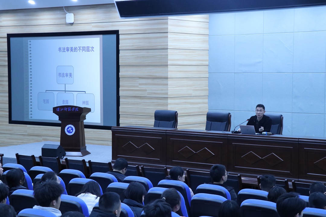 刘博士以“当代书法创作的审美特征”为主题展开了讲学活动。刘博士以学校的美术馆展出的书法作品为背景,讲述了书法审美的不同层次:笔圆、意圆、神圆。随后提出了新时期书法发展的三个阶段,深刻讲述了高等书法教育助推技术理性的问题,同时也指出:书法作为文化系统中的子门类,也不可避免打上技术的烙印。紧接着,刘博士从创作过程的实验特性,作品产生的流程,笔法特征,形制特征等方面做出介绍,用优秀的书法作品加以讲解。