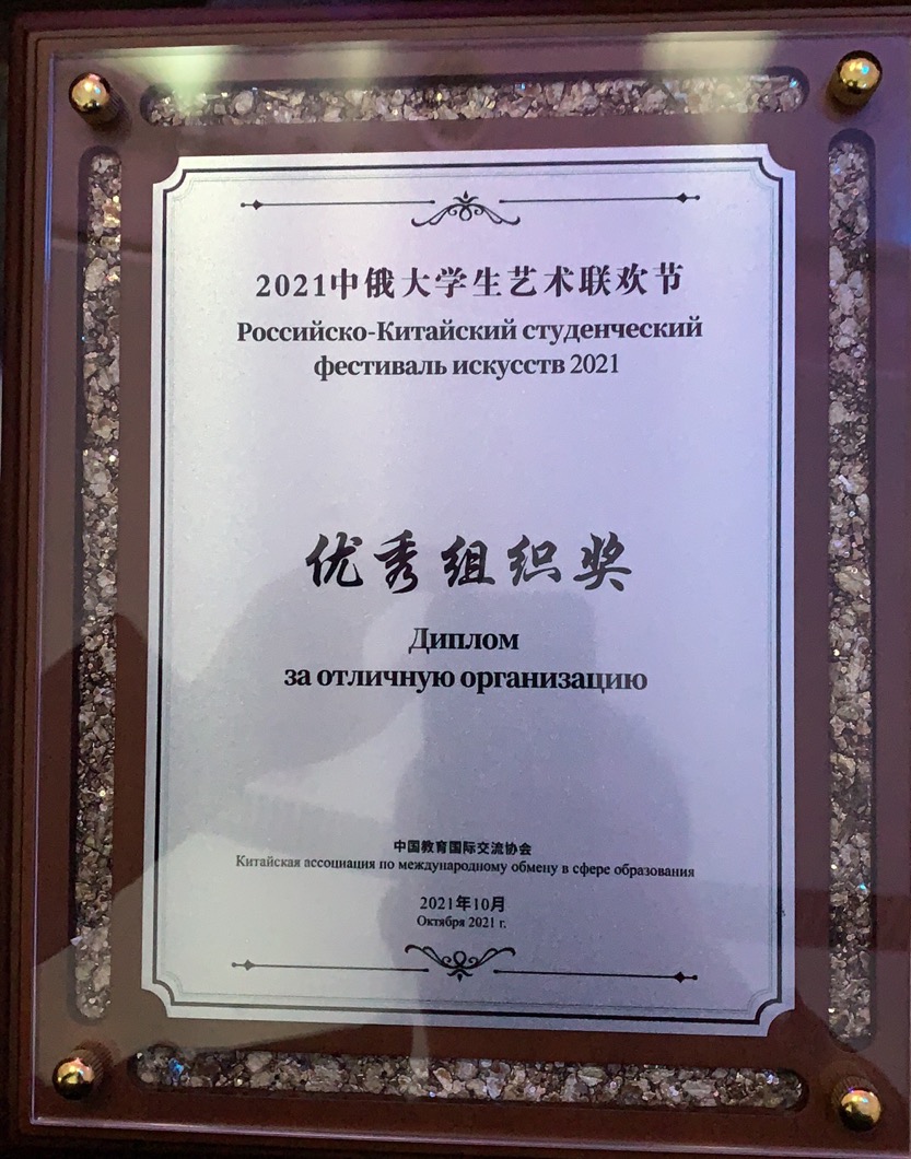 2021年10月14日,2021中俄大学生艺术联欢节颁奖典礼及展演活动在吉林长春成功举办,汉江师范学院文学院荣获优秀组织奖。
