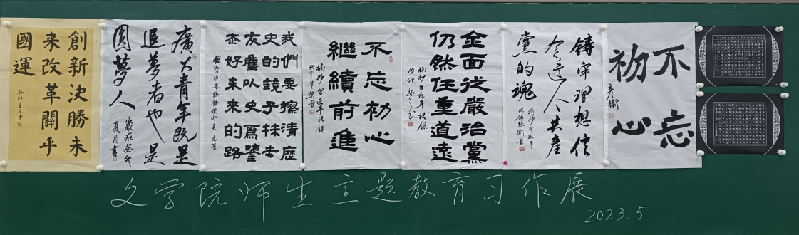 用书法来表现党建内容,是文学院把专业与党建相结合的一个成功尝试。在建党100周年、喜迎二十大等特殊节点,以及党史学习教育、党风廉政宣教月活动、推普宣传周、汉语言文学专业师范认证等重要活动时期,文学院书法专业师生都能及时通过书法作品为活动添彩。通过书写党建内容,师生思想受到了再教育,书法艺术更具灵魂;用书法的形式展示党建内容,党建的吸引力更强,党建活动的载体更加丰富。