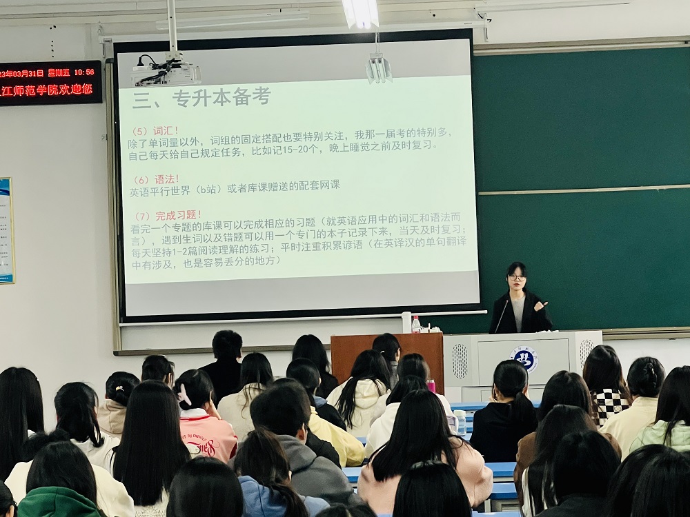 作为21级汉语言专升本专业排名第一的优秀学子,何佳卉同学结合个人经历和所考专业向同学们介绍了有关专升本的详细内容。她对专升本志愿选择、考试内容、备考过程及心态调整等问题进行了讲解。