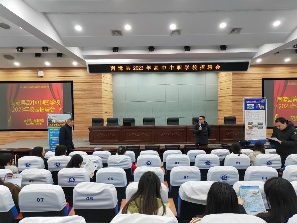为认真落实校党委对毕业生就业创业工作的决策部署,拓宽毕业生就业渠道,3月25日上午9点,由学校招生就业处主办,文学院和物理与电子工程学院承办的南漳县2023年高中(中职)学校校园招聘会,在明理楼C101举行。