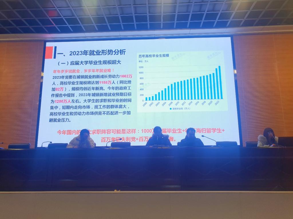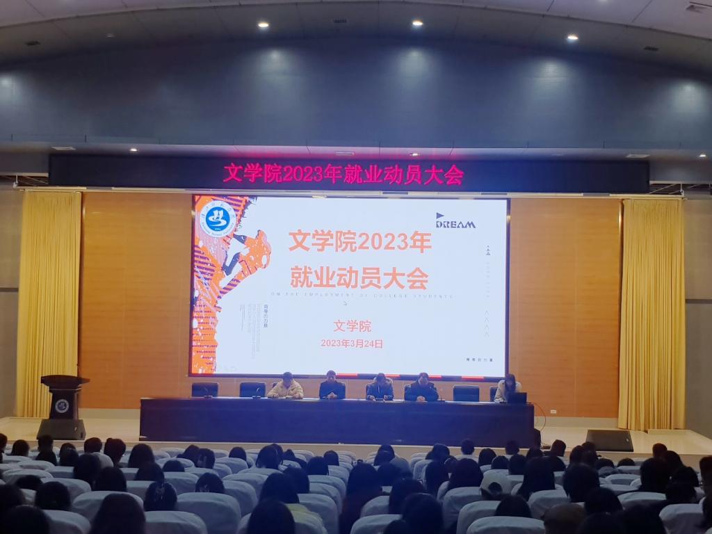为帮助2023届毕业生深刻认识当前的就业形势和就业压力,进一步做好2023届毕业生就业工作,全方位、多举措提升毕业生就业率和就业质量,2023年3月24日晚7点,文学院在学术报告厅召开2023届本科毕业生就业动员大会,文学院院长郝文华、党总支副书记任自玲、学工办主任彭涛、毕业班辅导员柳宇和蔡兆祝老师,以及文学院2023届全体本科毕业生参加此次大会。