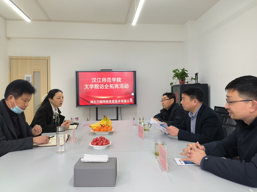 3月21日上午,文学院院长郝文华、副院长曹国军,教务处副处长李新锋来到湖北万维网络信息技术有限公司,就大学生创新创业、实践就业等问题进行交流,初步达成了合作意向,收到预期效果。