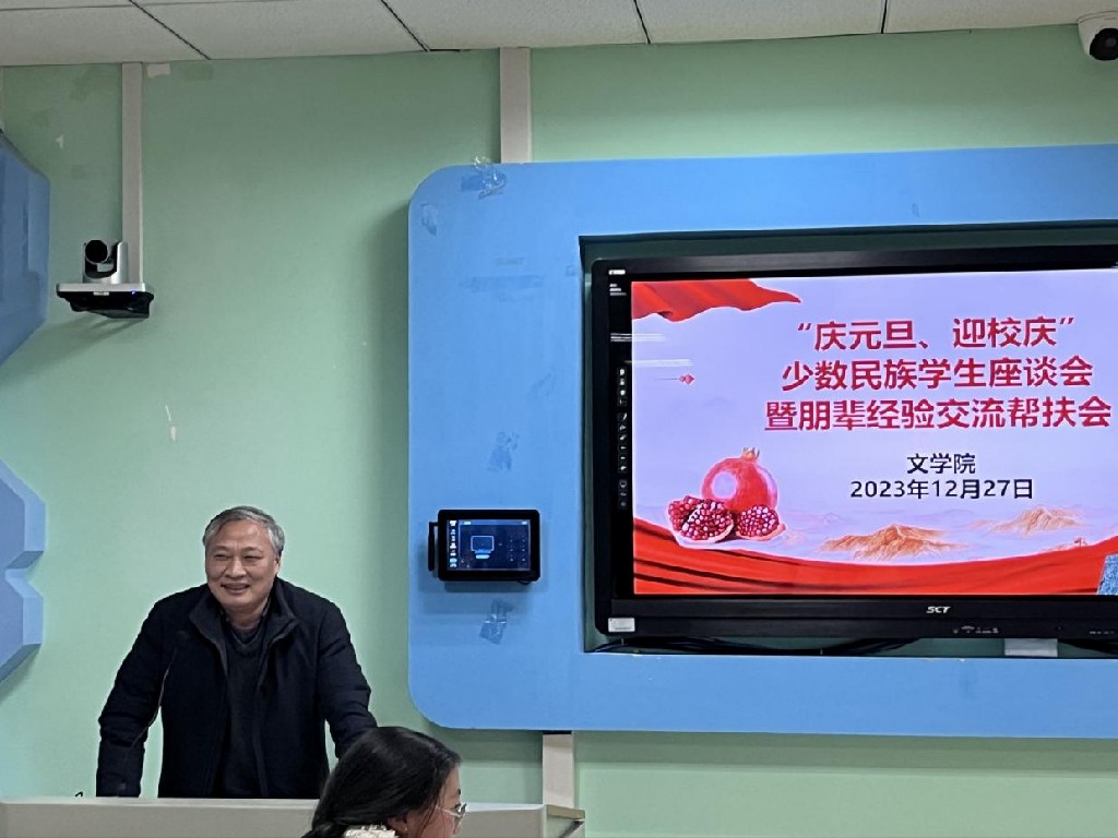 为深入贯彻习近平总书记关于民族团结进步的重要讲话精神,加强学院各民族学生交往交流交融。2023年12月27日晚7点,文学院在崇文楼B405举办“庆元旦 迎校庆”少数民族学生座谈会暨朋辈经验交流帮扶会,党委统战部副部长王观华,文学院分党委书记曹弋,学工办主任魏东,分团委负责人郑胜男,辅导员柳宇、杨超、蔡兆祝出席座谈会,会议由辅导员王妮澳主持。