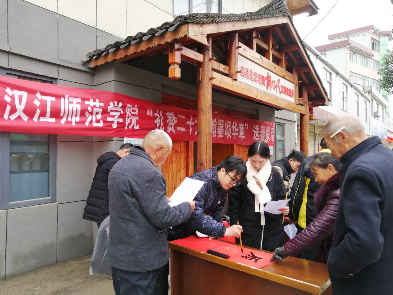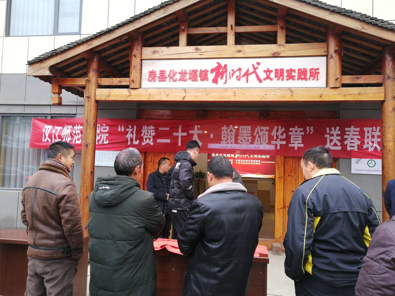 2024年1月2日,文学院书法教研室教师黄振东、邵常铭,书法专业学生陈彦冰、陆柯全、吴晓玲等6人,前往十堰市房县化龙镇,举行“礼赞二十大·翰墨颂华章”写春联、送春联活动,为房县人民送上2024年的新春祝福。