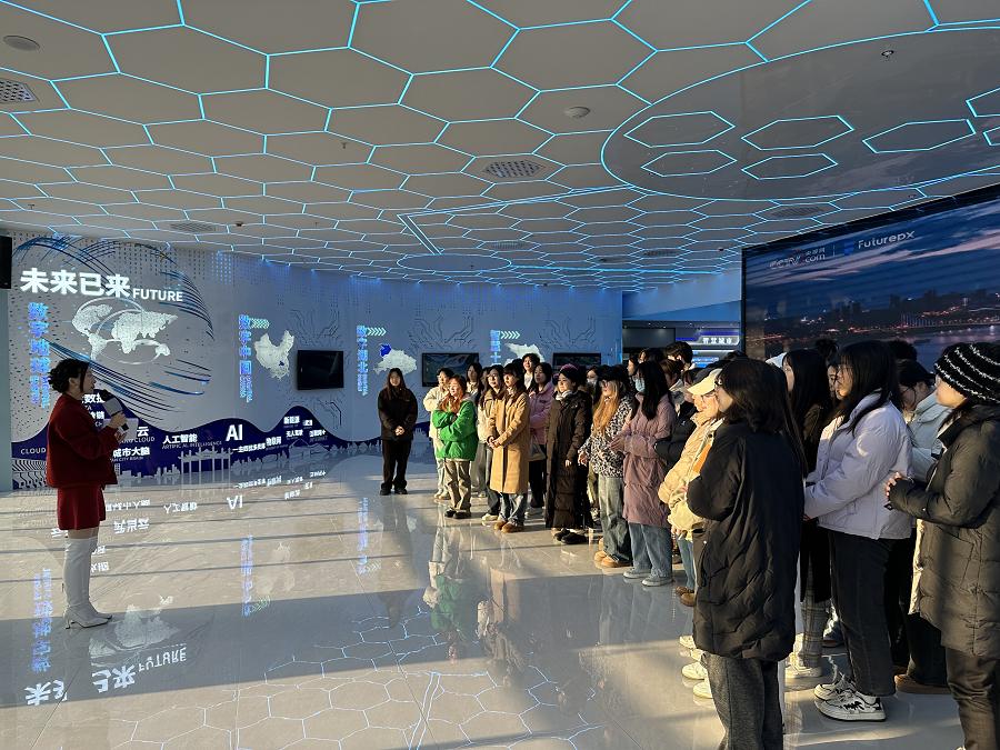 学生们来到展厅参观,观看了十堰智慧城市建设宣传片,了解产业园基本情况。产业园负责人详细介绍了产业园的发展与功能定位,提到了未来将建成“智慧城市”的愿景,并对入驻企业与发展现状做了详细介绍。