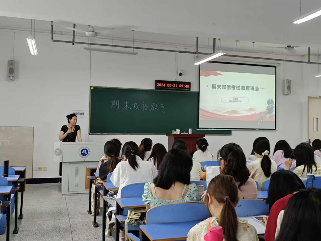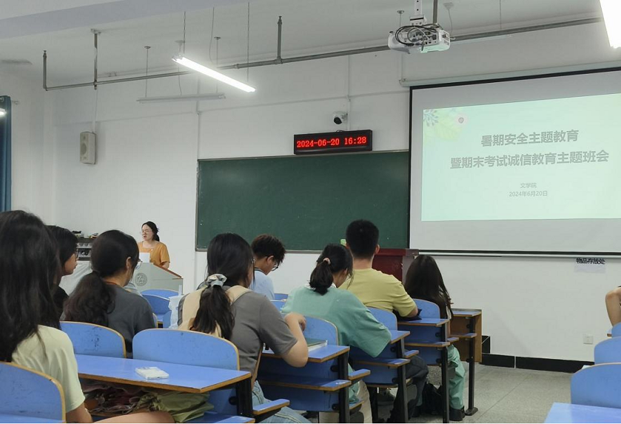 为进一步增强文学院学生的安全意识和诚信意识,做好放假前和暑假期间学生安全管理工作,切实加强文学院学生暑期安全教育和诚信教育,2024年6月20至21日,文学院各班召开了暑期安全教育暨期末考试诚信教育主题班会,班会分别由辅导员郑胜男、杨超、王妮澳、柳宇主持,2021级、2022级和2023级全体学生参与。