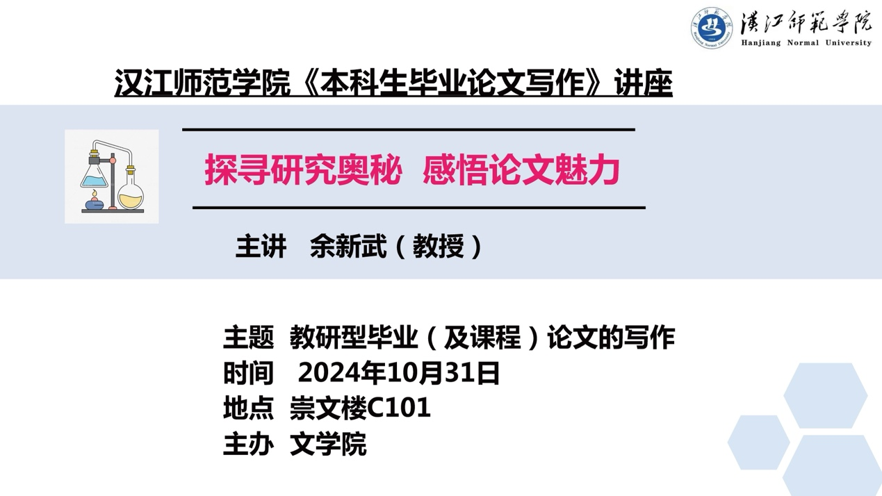10月31日下午,我校外聘专家、湖北师范大学余新武教授为我院师生带来题为《探寻研究奥秘感悟论文魅力》的论文写作专题讲座,此次讲座由副院长贾君芳主持,讲座在崇文楼C101举行,全院教师和汉语言文学专业200余名学生参加。