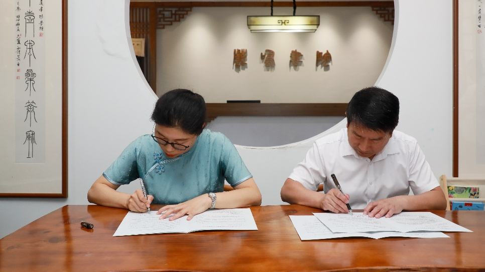 5月19日下午,文学院院长郝文华、书法教研室教师曹国军、书法学2023级学生胡思思一行来到鹿鸣书院,进行访企拓岗,签约书法学专业实习基地。鹿鸣书院董事长刘新、校长薛锋及全体教职工共同出席活动。
