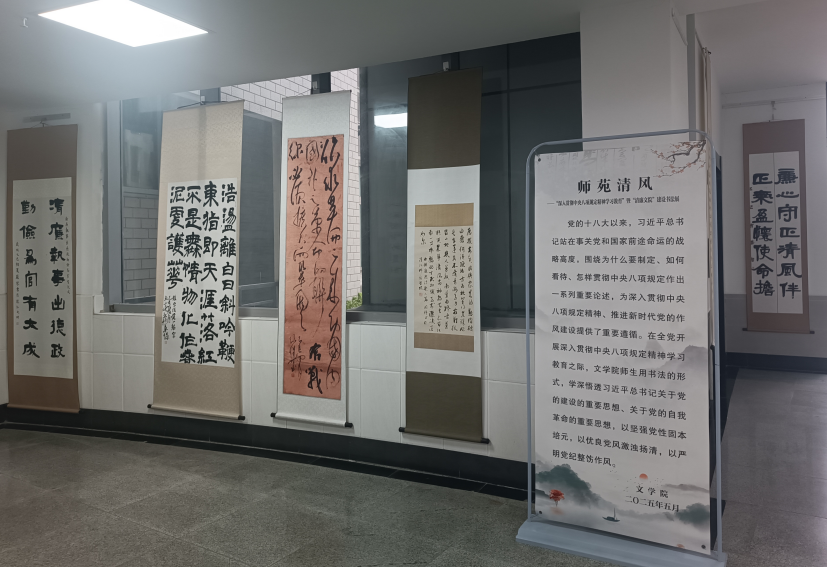 近日,崇文楼B区门厅悬挂的一幅幅书法作品引人注目,这是文学院“清廉文院”系列活动之一,也是该学院深入贯彻中央八项规定精神学习教育的一项内容。