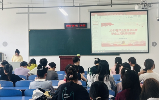 2025年6月11日,文学院学生党支部召开毕业生党员离校教育会议。学生一支部书记王妮澳、二支部书记蔡兆祝围绕组织关系转接、就业指导等主题为毕业生党员讲授"最后一课"。