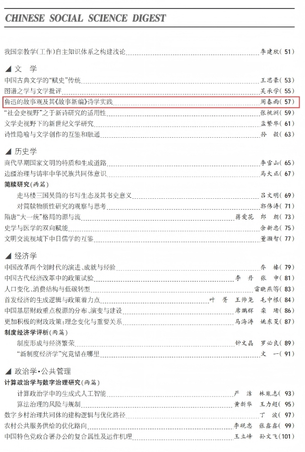 《中国社会科学文摘》2025年第4期“文学”栏目全文转载文学院教师周春雨的学术论文《鲁迅的故事观及其<故事新编>诗学实践》。该文是同期被转的一篇来自地方院校青年学人的学术成果,原文发表在《华中学术》2024年第4期。