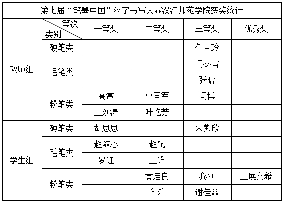 近日,第七届中华经典诵写讲大赛“笔墨中国”汉字书写大赛湖北赛区评比结果揭晓,文学院师生表现优异,所选送的18件作品均获奖,包括一等奖5项、二等奖6项、三等奖6项,优秀奖1项,其中书法学专业师生共获奖13项,汉语言文学专业获奖5项,学校获得“湖北赛区优秀组织奖”。