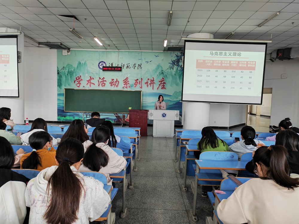 最后,文学院教师章文婧就考研形势和院校选择对同学们进行了深入指导,章老师通过详实数据的展示,为同学们讲解了目前激烈的考研竞争形势,同时为同学们进行了报考学校的推荐,提醒同学们一定要结合自身实际情况,合理选择目标院校,准确定位,不能好高骛远。