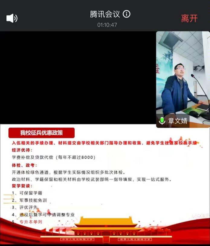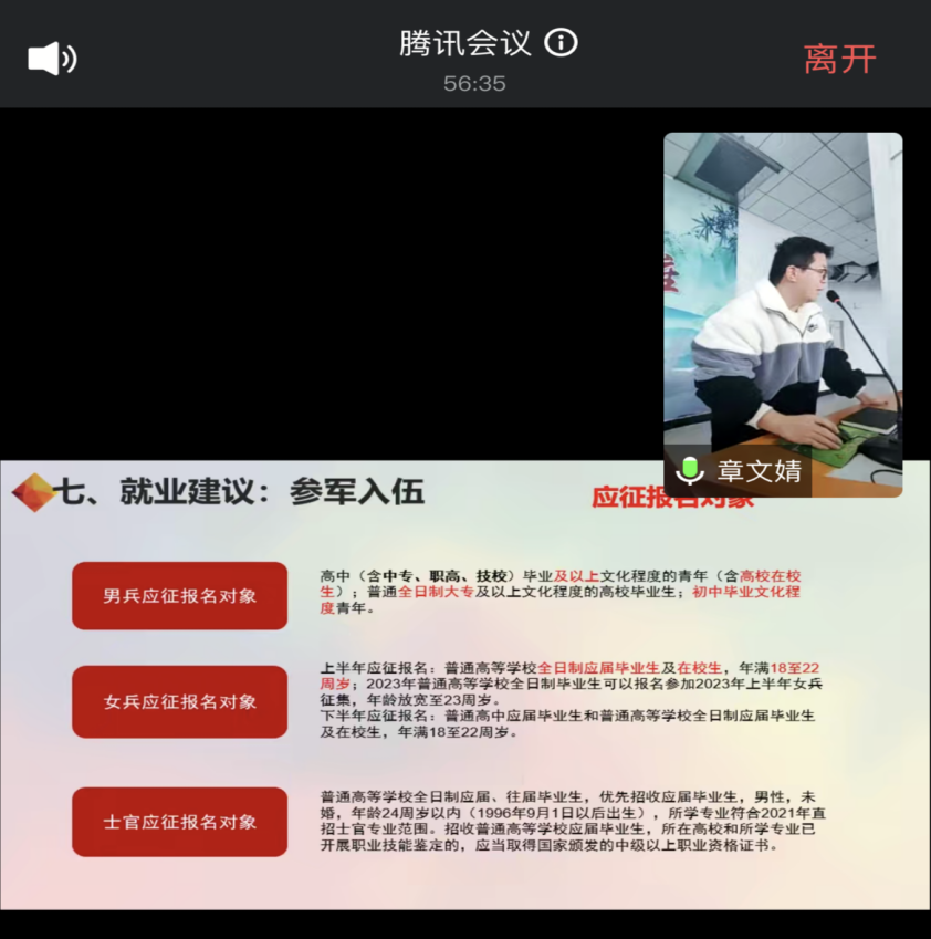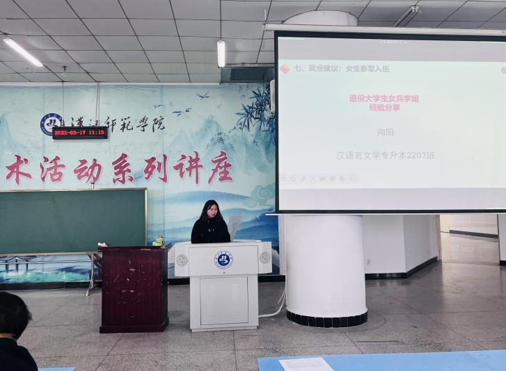 语教专业辅导员蔡兆祝老师为同学们进行了关于征兵入伍优惠政策以及报名应征等一系列内容的讲解。为了让同学们了解得更加深入,文学院还邀请了原17级语教专业、现2022级汉语言专业的退伍大学生向阳同学来进行经验交流。向阳同学分享了自己入伍前后的全过程和在部队中主要从事的工作内容,以及在校入伍的优势,向同学们证明参军入伍是一项光荣的事业,对大家今后的升学就业也有极大帮助。