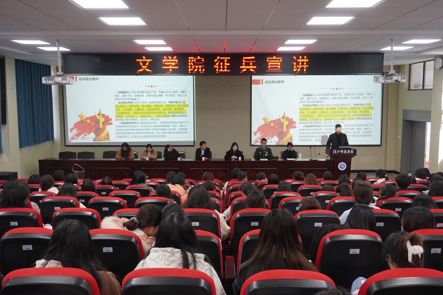 为积极响应国家号召,扎实推进大学生应征入伍工作,3月14日,文学院院长郝文华、分党委副书记陈明、辅导员及退役学生代表在丹江校区报告厅开展征兵宣传工作,全体21级学生通过线上和线下结合的方式参加会议,会议由辅导员郑弘洁主持。