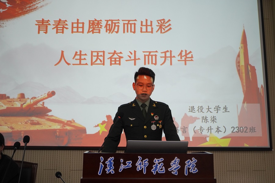 汉语言(专升本)2302班陈柒同学结合个人入伍经历,从入伍保障、部队发展、退役安置、经济补助、相关政策等方面讲述自身军旅生涯的收获和体会,并对同学们的疑问进行细致解答。