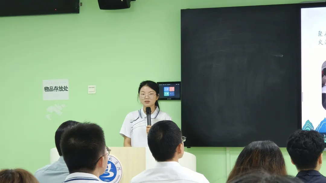 刘星宇作为同学代表发言。她从潜心深耕于日常、力学笃行而远志、千锤百炼丰底蕴三个方面展开。汇报中介绍了教师班的多元化课程,线上与线下结合,理论与实践共进,丰富的课程也拓宽了同学们学习的窗口,也让同学们深知一位合格的教育工作者需要的功底之深、责任之切,学海无涯,同学们任重而道远。