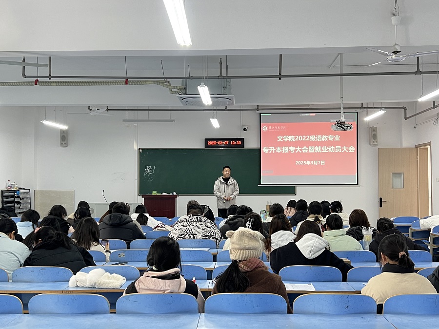 3月7日中午,文学院在崇文楼A716,通过线上线下相结合的方式召开了“2025届专升本报考大会暨就业动员大会”,2022级小学语文教育专业全体学生参加本次动员会。