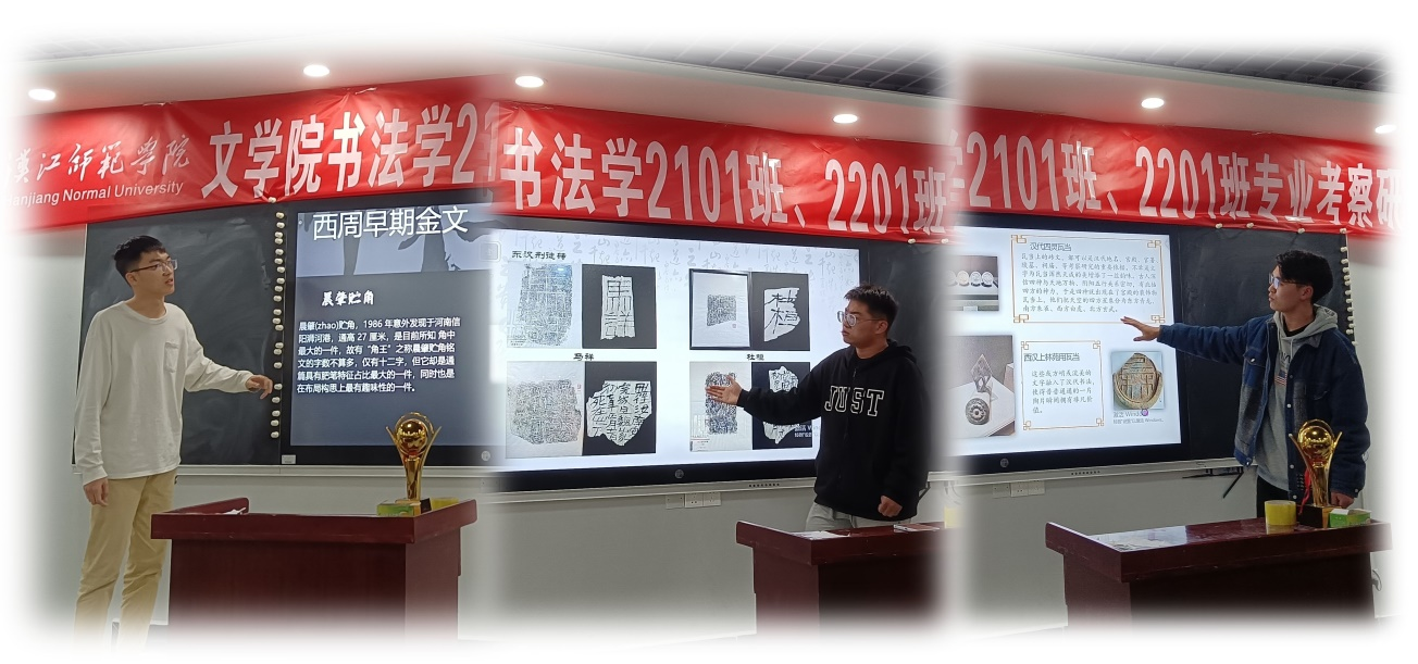 本次研学考察总结大会以考察途中所访金文书法和碑刻为主要研究对象,同学们以小组为单位,分工明确,派代表上台陈述,时间上限为十分钟。曹钰同学从金文和汉简的角度出发,讲到金文的特点比甲骨文秀丽且直笔多,方圆规范,笔画粗细均匀,严整清晰,反映了金文字体结构疏密相间的特点。李雪娇同学从书法历史的时间轴的角度出发,分析先秦到汉代碑刻的书风演变。瞿昊程同学从北魏到南北朝文化的共同点和不同之处出发,分析北魏晚期碑刻受南朝和北朝的书风影响,从而变得饱满,同时又融入了北魏的字形的妍美和古拙。孙润东同学分享对金石文的见解,结合自己对书法的认识,表达了自身的理解和感悟。