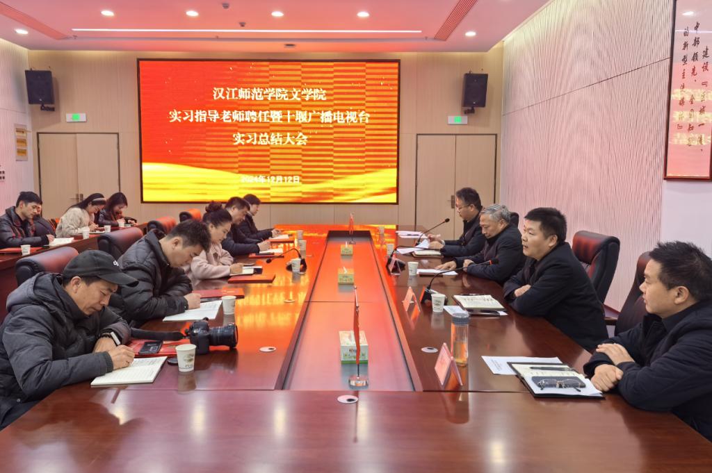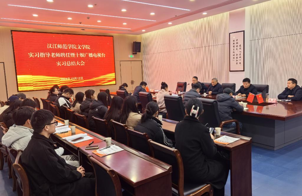 12月12日下午四点,汉江师范学院文学院在十堰广播电视台B303会议室隆重召开实习指导教师聘任暨十堰广播电视台实习总结大会。文学院分党委书记曹弋、十堰广播电视台党委常委副总编辑贺翔、党委常委副台长,文学院新闻传播教研室主任戴文雄,以及受聘的15位实习指导教师和在十堰广播电视台的全体实习学生参加了本次大会。